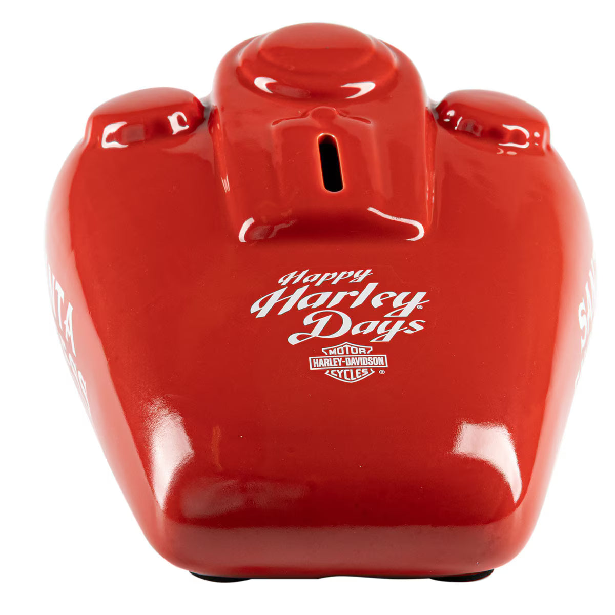 Tirelire en céramique rouge avec inscription « Happy Harley Days » et logo B&S sur le dessus. Logo Santa Express sur les deux faces. Bouchon amovible.