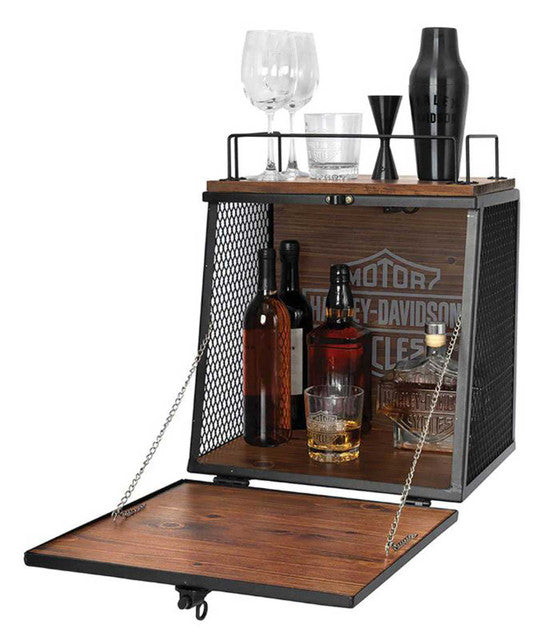 Barre murale Harley-Davidson® B&S, HDX-99321. Impressionnez vos invités avec cette barre murale Harley-Davidson® Bar & Shield. Elle présente une finition teintée foncée et le logo B&S imprimé. Rangez-y vos boissons, verres et accessoires de bar préférés. Accessoires non inclus. Dimensions : 41,6 cm (L) x 49,2 cm (H) x 31,8 cm (P).