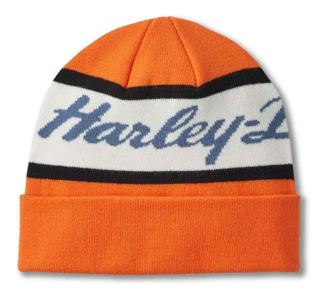 Bonnet Harley-Davidson® pour homme – Orange, 97631-25VM. Fabriqué en maille tricotée 96 % acrylique, 3 % polyamide et 1 % élasthanne. Taille unique. Tricot intarsia. 97631-25VM