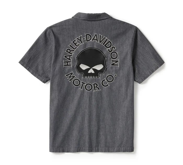 Le confort et l'art emblématique se côtoient dans la chemise en jean Willie G ™ Sk**l. Confectionnée en sergé de coton flammé épais, elle est délavée pour un effet texturé et usé (zoomez pour voir). Cette chemise boutonnée à manches courtes pour homme offre une coupe plus ample, inspirée des mécaniciens, et arbore des motifs audacieux de Willie G. Davidson. Découvrez son histoire : si sa tête est l'une de ses créations les plus populaires, le styliste emblématique Willie G. Davidson a également conçu plusieurs motos, dont la FX Super Glide® de 1971 et la FXS Low Rider® de 1977 .
