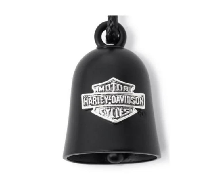 Clochette Harley-Davidson®, 34M00024. Clochette gravée avec logo B&S classique et attache, noire. Fabriquée en laiton robuste plaqué argent. Cordon de suspension inclus. La légende raconte que les mauvais esprits de la route s'accrochent aux motos depuis aussi longtemps que les motos circulent. Ces mauvais esprits sont responsables des problèmes mécaniques et de la malchance en cours de route. La légende raconte qu'en attachant une petite cloche à votre moto, les mauvais esprits de la route se retrouvent piégés à l'intérieur de la cloche, où le tintement constant les rend fous, les faisant perdre prise jusqu'à ce qu'ils tombent au sol. (Vous êtes-vous déjà demandé d'où viennent les nids-de-poule ?) La légende raconte que le mystère de la cloche gardienne est doublement puissant lorsqu'elle est offerte par un ami ou un proche.