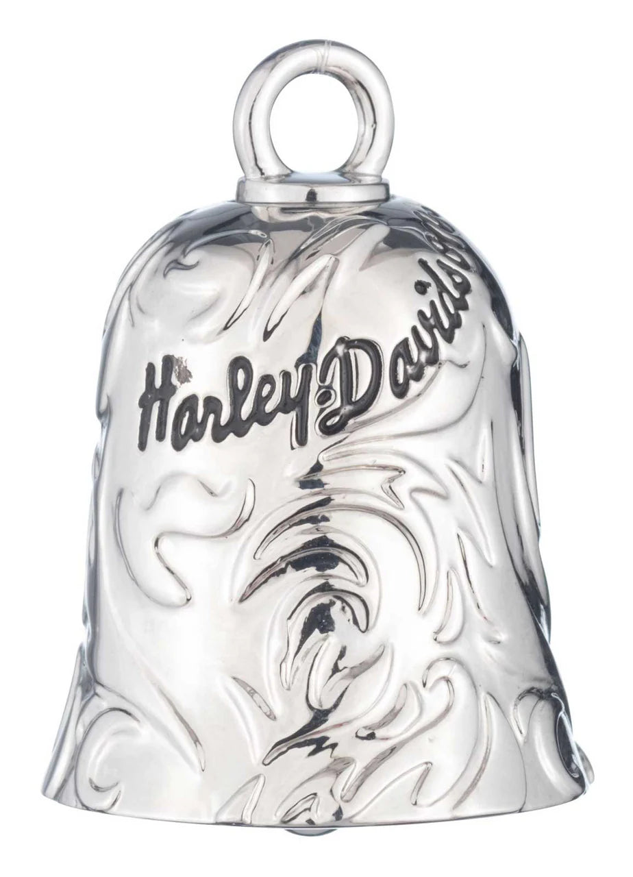 Clochette Harley-Davidson® Ride, 34M00082. Présente un magnifique motif de plume avec inscription Harley-Davidson® gravée. Fabriqué en laiton durable avec placage argent. Comprend une corde pour le support.
