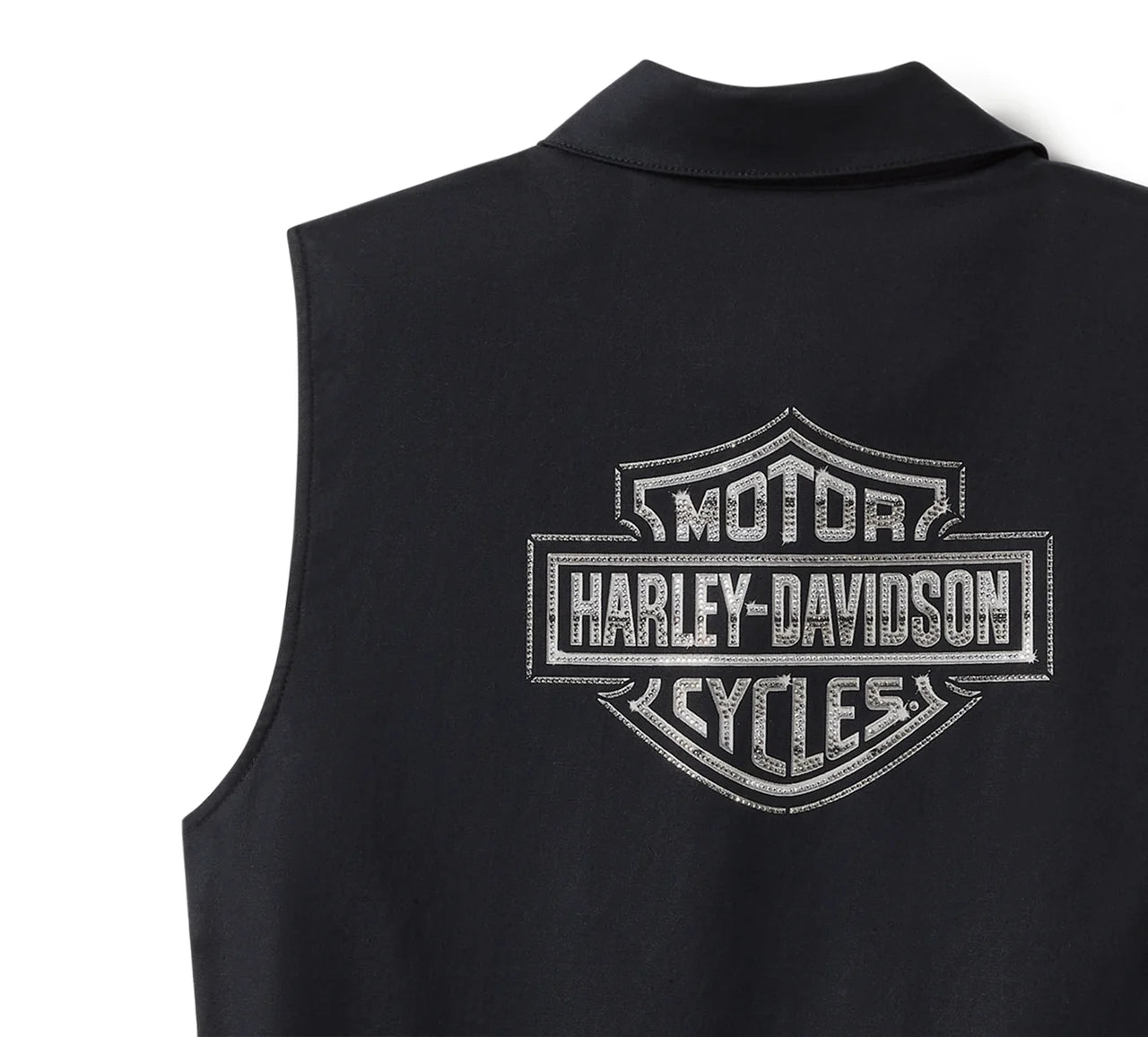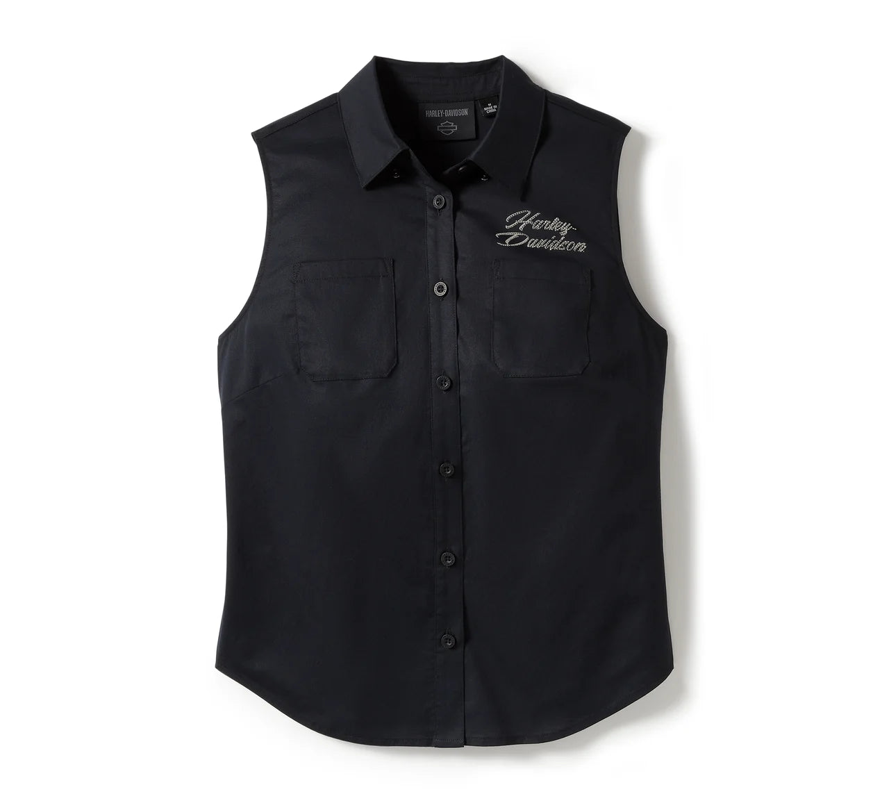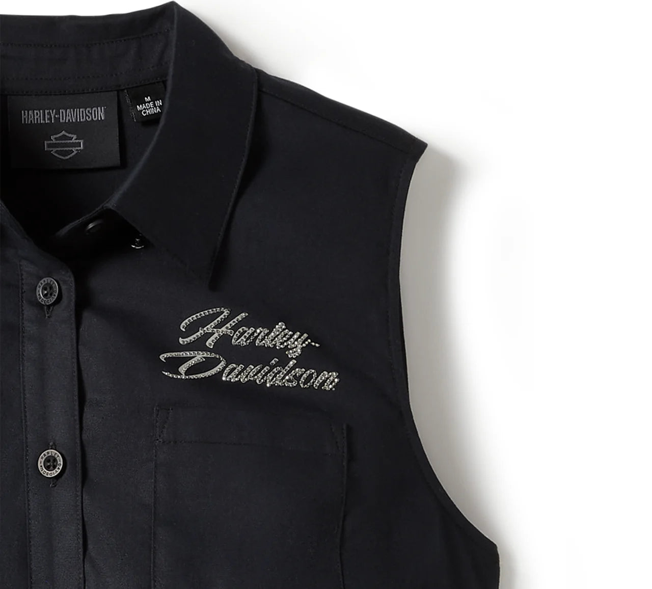 Ajoutez une touche de glamour à votre style motard avec notre débardeur Essential Bling Button Front. Confectionné dans un mélange de coton, Tencel® et lin pour un confort durable, ce haut boutonné sans manches pour femme est doté de pinces poitrine flatteuses et d'un col à boutons-pression dissimulé qui ne flotte pas sous les vêtements de moto. Nos motifs décoratifs ornent le devant et épousent le dos pour un look 100 % Harley-Davidson.