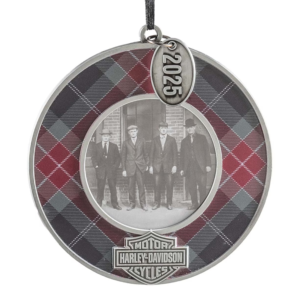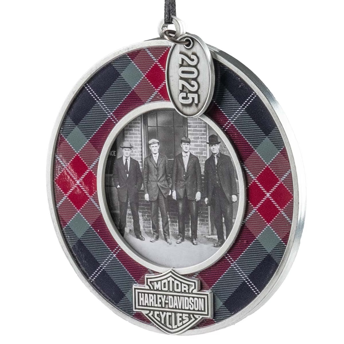 Mini cadre photo décoratif en métal avec émail à motif écossais festif. Logo B&S personnalisé. Médaillon 2025. Peut contenir une photo de 6 cm de diamètre.