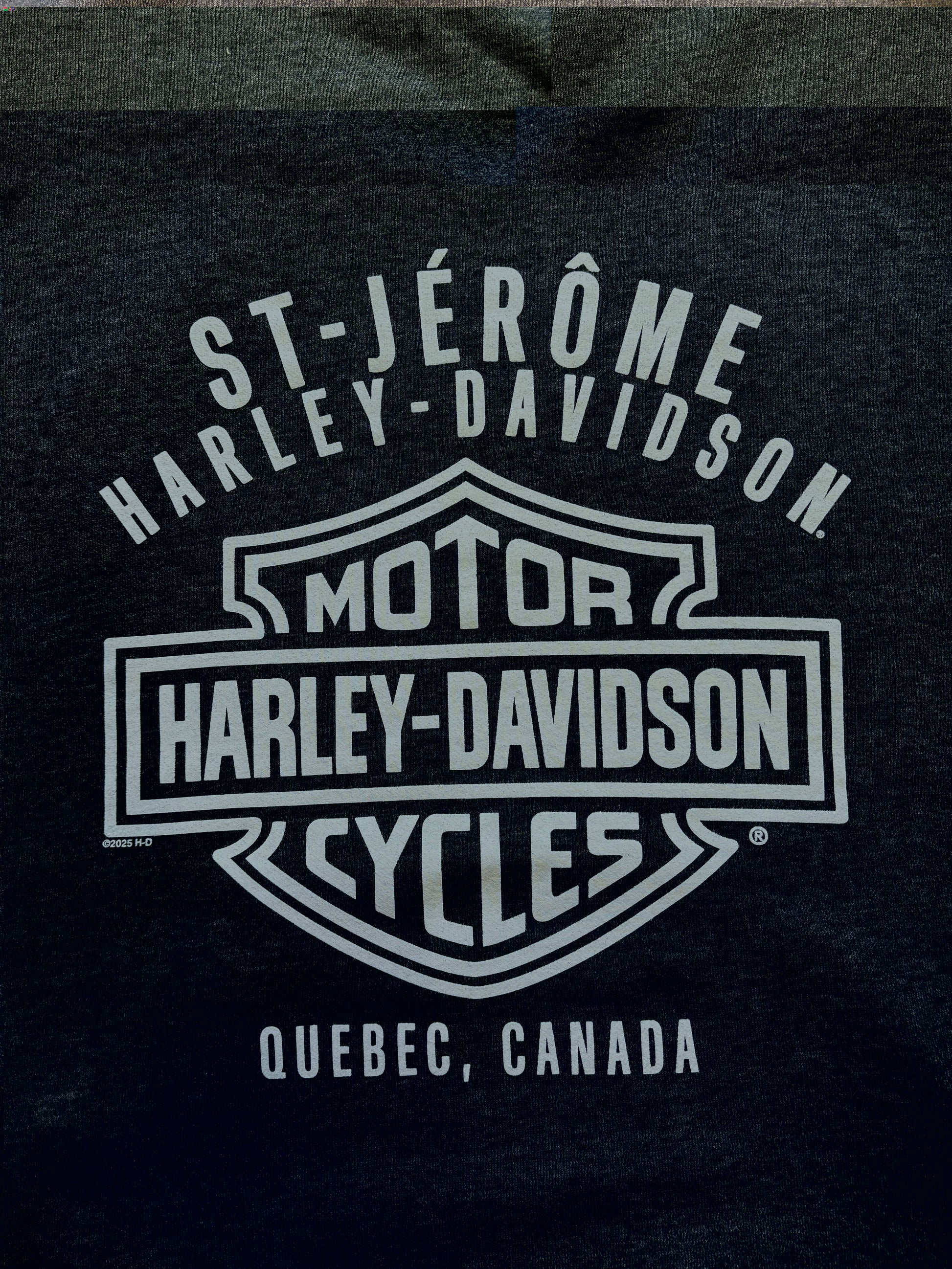 Portez les couleurs de St-Jérôme Harley-Davidson! Toute nouvelle collection de t-shirt homme et femme, parfaite pour afficher votre appartenance à la famille St-Jérôme Harley-Davidson ou bien pour un souvenir unique de votre visite dans les Laurentides! Les couleurs au dos peuvent varier et s'harmoniser selon la couleur du chandail. Rugissez haut et fort avec ce t-shirt à notre effigie. (remarque : peut être assorti à la couleur du motif du devant) Ajoutez- les rapidement à votre panier les grandeurs partent rapidement!