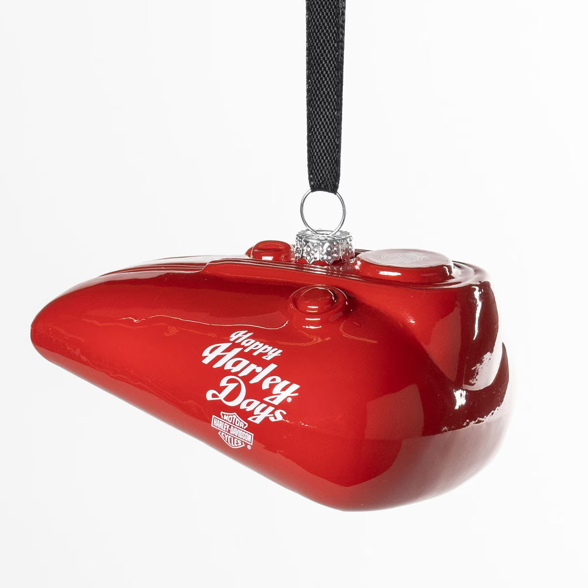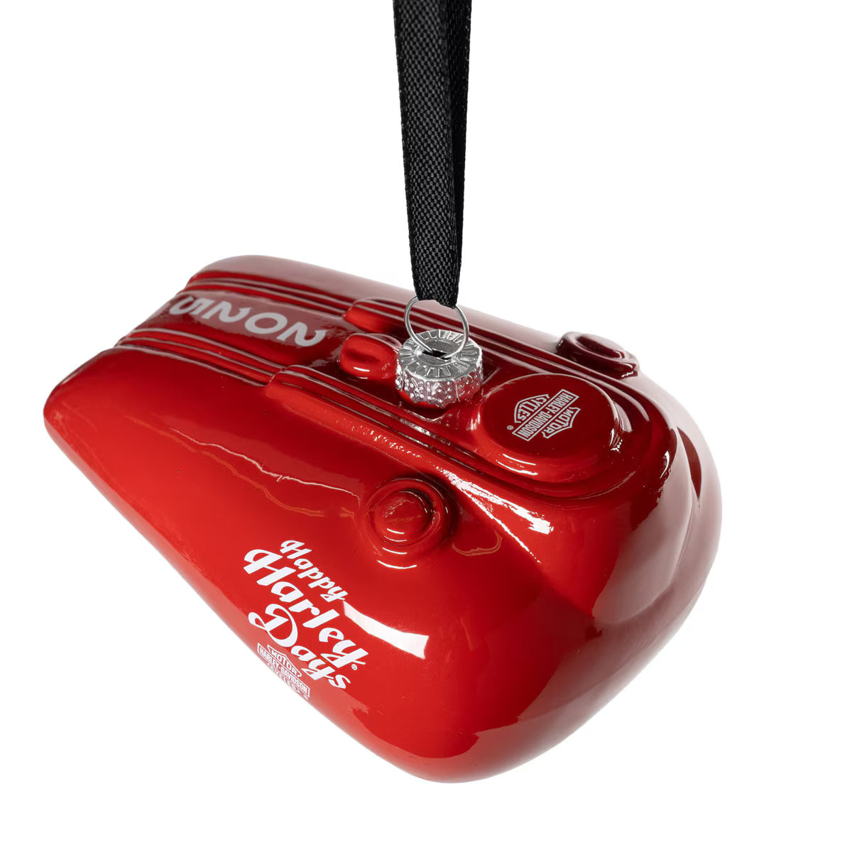 Ornement de réservoir d'essence en verre soufflé rouge, orné des autocollants Santa Express et Happy Harley Days. Daté de 2025.