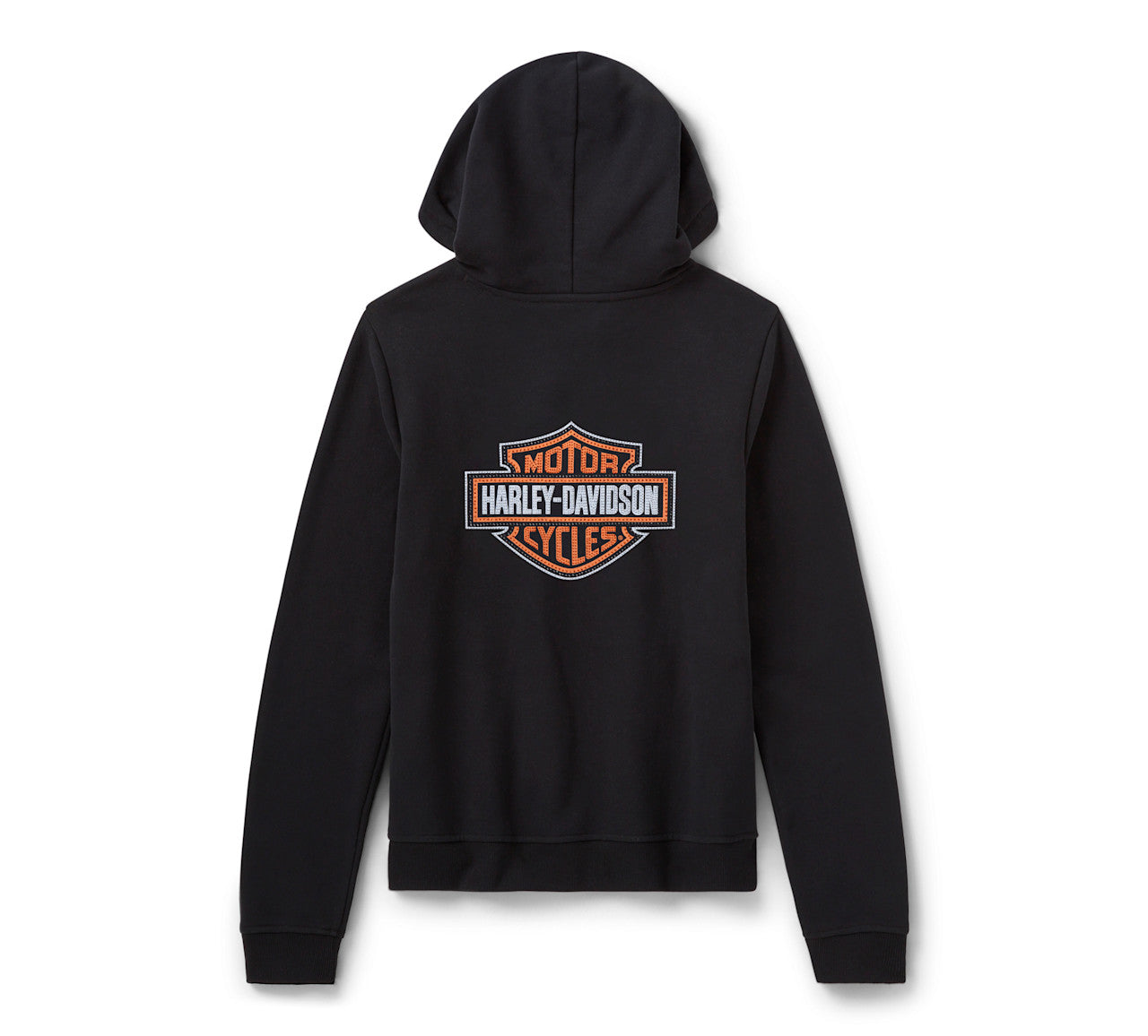 Rehaussez votre look Harley classique d'une touche d'éclat avec notre sweat à capuche Essential Bling. Confectionné en molleton de coton/polyester pour un confort optimal, il offre une coupe décontractée. Ce sweat à capuche pour femme est orné de strass sur les deux faces.
