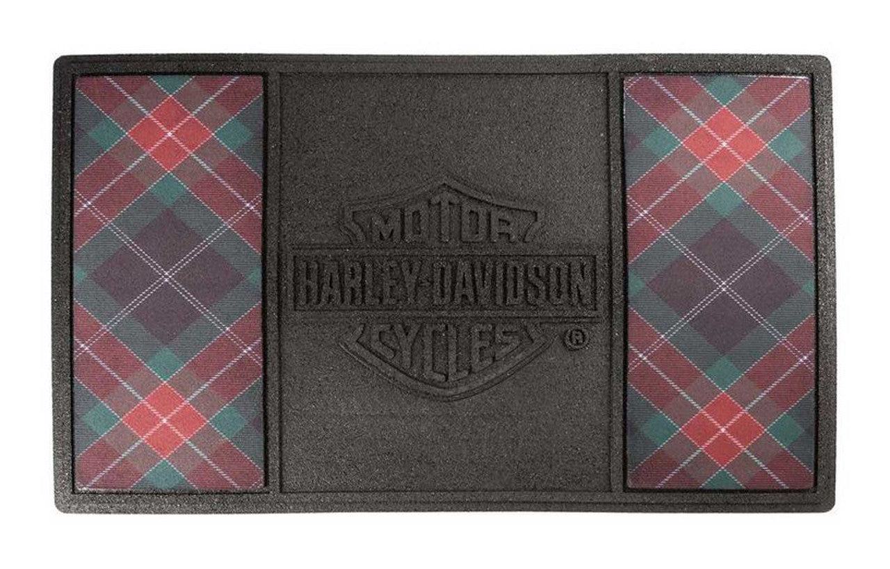Tapis d'entrée Harley-Davidson® en caoutchouc résistant, motif écossais festif, HDX-99347. Accueillez vos invités avec style grâce à ce tapis d'entrée haut de gamme Harley-Davidson® en caoutchouc. Logo B&S personnalisé et accents écossais floqués. Conçu pour durer, ce tapis robuste est fabriqué en caoutchouc antidérapant résistant aux intempéries et retient la saleté, la boue et les débris. Idéal pour votre entrée, votre garage ou votre atelier. Dimensions : 76 cm (largeur) x 46 cm (hauteur).